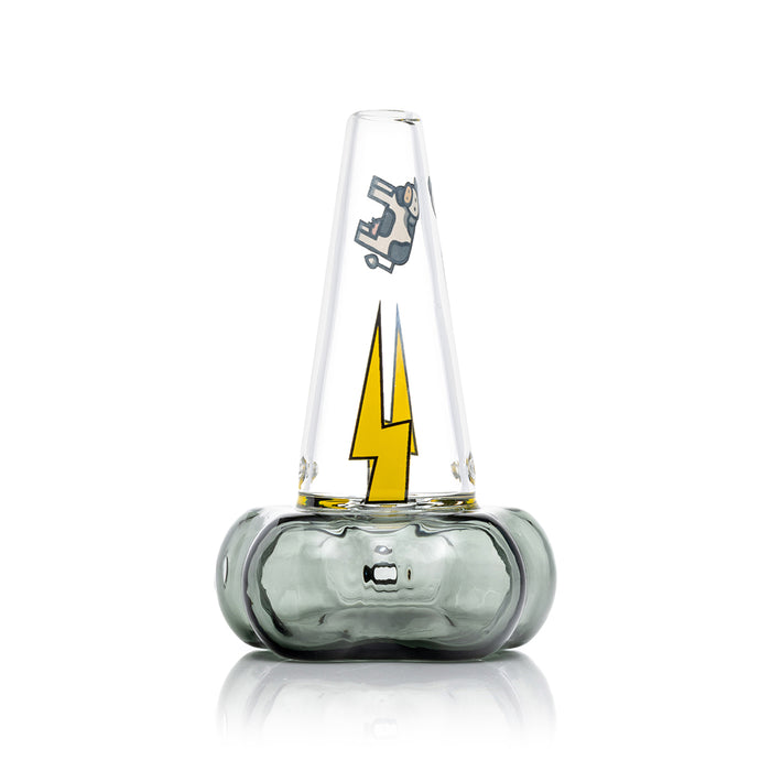 This glass themed hand pipe from Hemper is a durable and functional glass hand pipe. The deep bowl lets you pack a large amount of your dry herbs or tobacco, while the thick borosilicate glass ensures this pipe will last. This hand pipe is about 4" long and features distinct thunder bolts on the base of the pipe.SPECS: